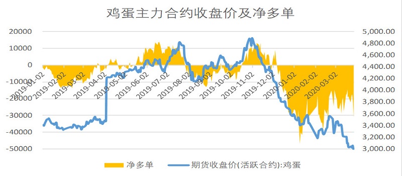 我們選取會(huì)員單位前20名作為品種的主力資金動(dòng)向的參考,相關(guān)性較強(qiáng),但指標(biāo)滯后,不能作為短線交易指示。滯后指標(biāo),可以用來(lái)印證趨勢(shì)。本周主力資金繼續(xù)流出,多空主力資金均有減倉(cāng)動(dòng)作,資金關(guān)注度逐漸下降。當(dāng)前雞蛋價(jià)格上下兩難,炒作空間逐步變小,這就意味著上漲的可能性降低。