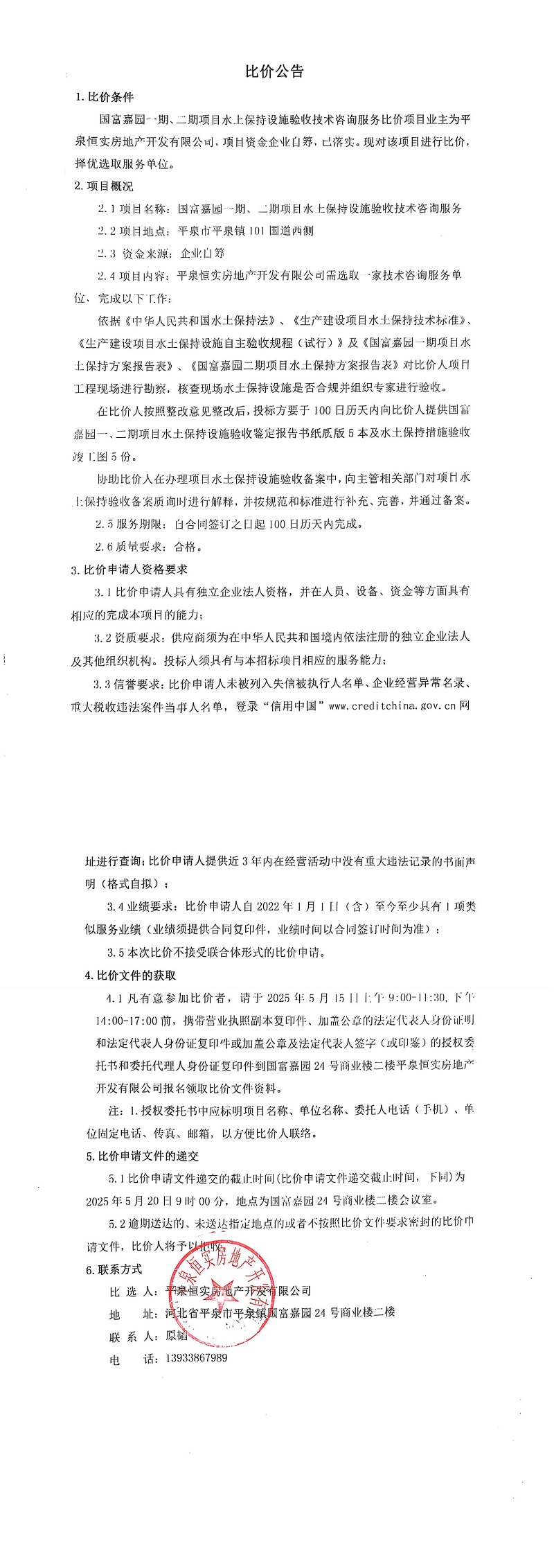 平泉國(guó)富嘉園一期、二期項(xiàng)目水土保持設(shè)施驗(yàn)收技術(shù)咨詢服務(wù)比價(jià)公告